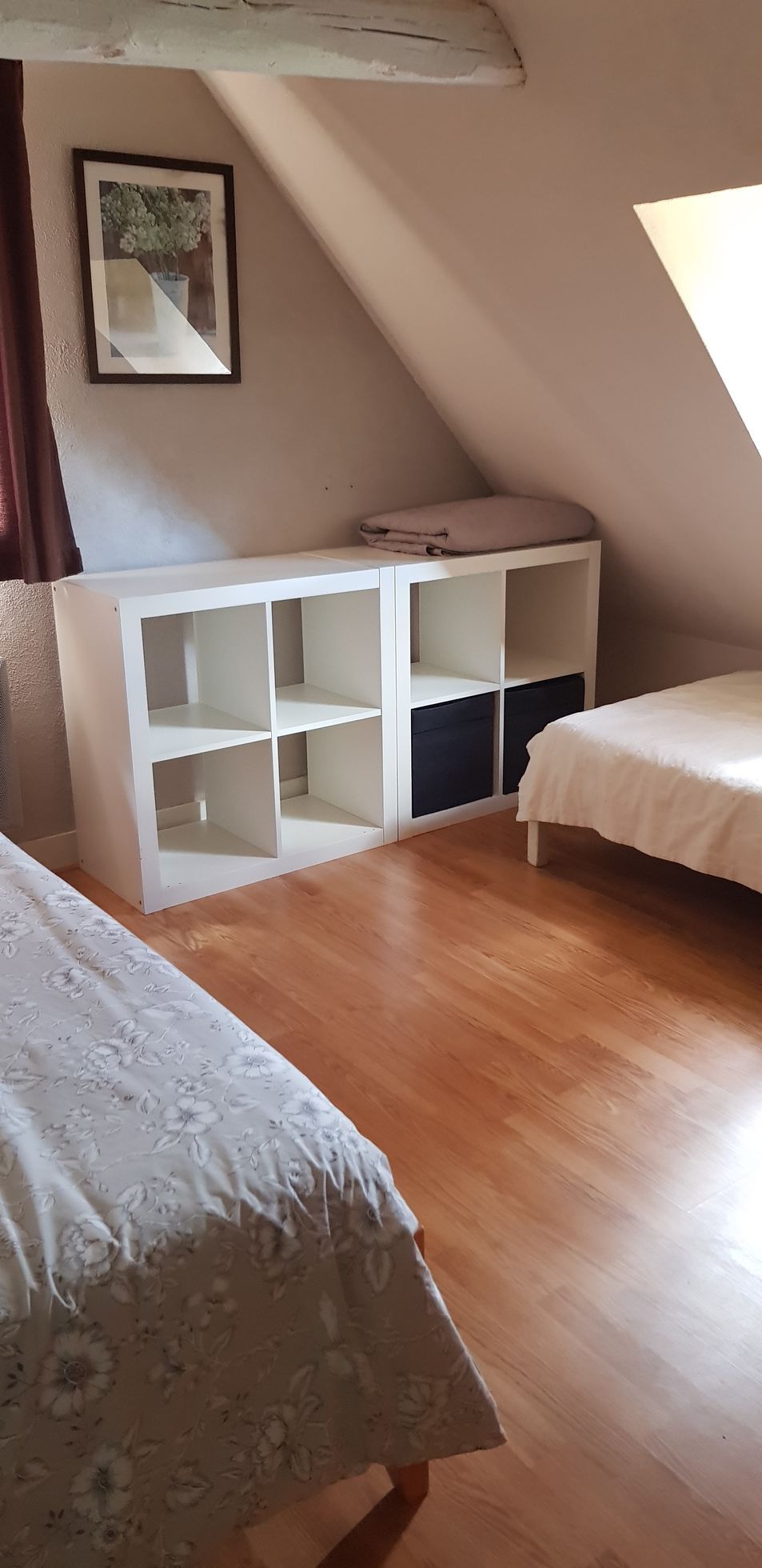 De kleine slaapkamer heeft twee eenpersoons bedden, opgesteld in een L-vorm. Er is een vakkenkast voor de kleding en haken aan de muur voor hangkleding. Op de overloop is een heuse bedstee. Een heerlijk knus weg kruip plekje voor de kinderen. De bedstee is geschikt voor kinderen tot een lengte van 150 cm.