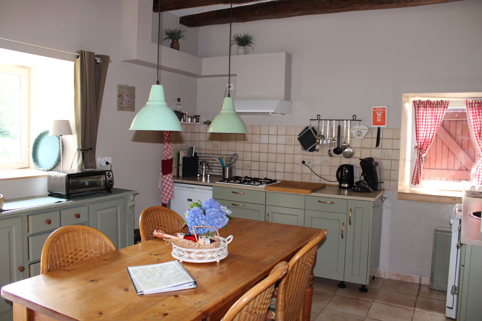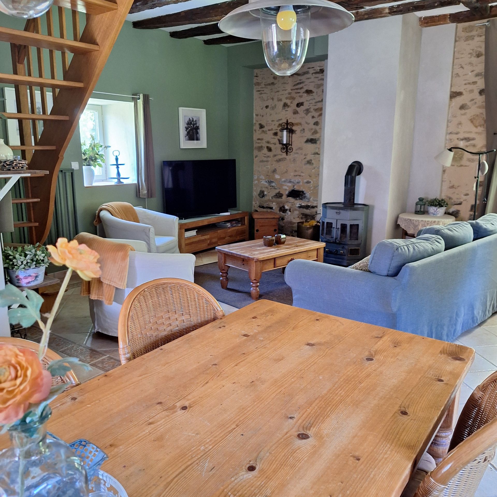 De huiskamer heeft een gezellig zitje met driepersoonsbank en 2 fauteuils rond de houtkachel.